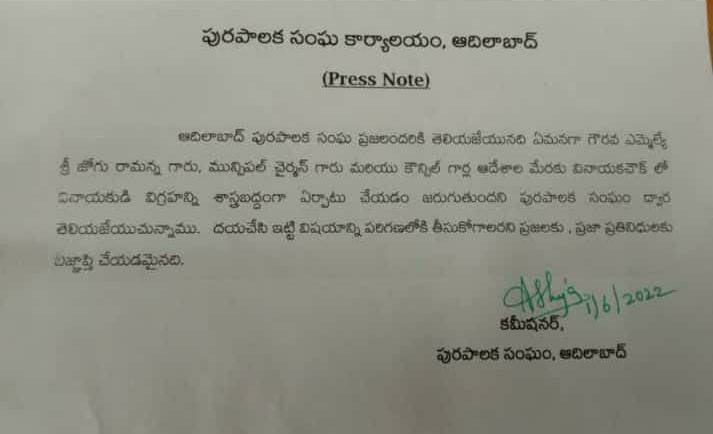 ఆదిలాబాద్ లోని వినాయక చౌక్ లో శాస్త్ర బద్దంగా వినాయక విగ్రహం ప్రతిష్టిస్తాం. కమీషనర్ ప్రకటన.