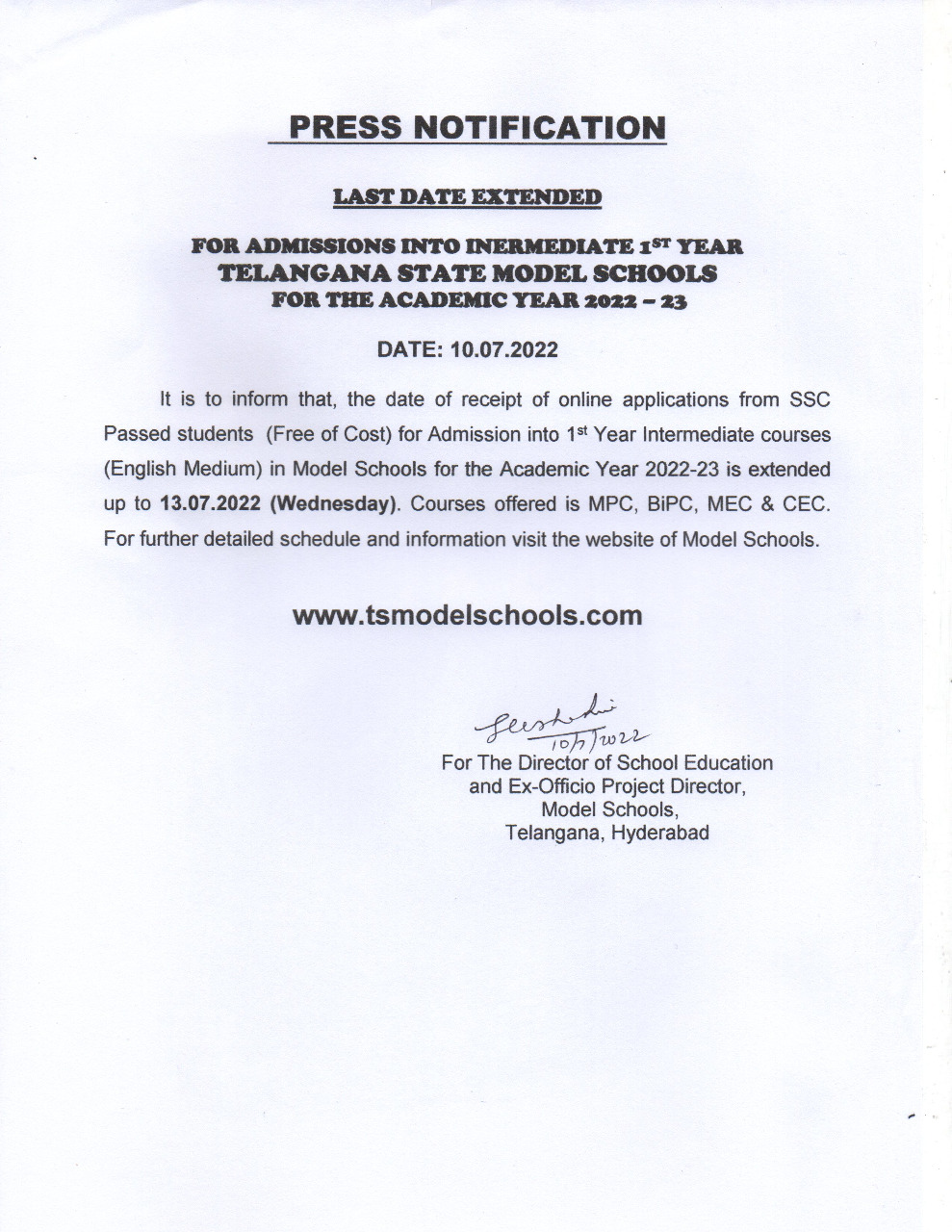 2022..2023విద్యాసంవత్సరంలోఆదర్శపాఠశాలలో మొదటి సంవత్సరం ఇంటర్ కోర్సెలలో ఎంపిసి, ఎచ్ఈసి,ఎంఈసి, సిఈసిలలోప్రవేశంపొందేందుకు ఆన్లైన్లోదరఖాస్తులుసమర్పించుకోవాలని,వారి కోసం ఈ నెల13 వ తేదీ చివరి తేదీ అని తెలంగాణ మాడల్ పాఠశాలల డైరెక్టర్ ఒకప్రకటనలో పేర్కొన్నారు.