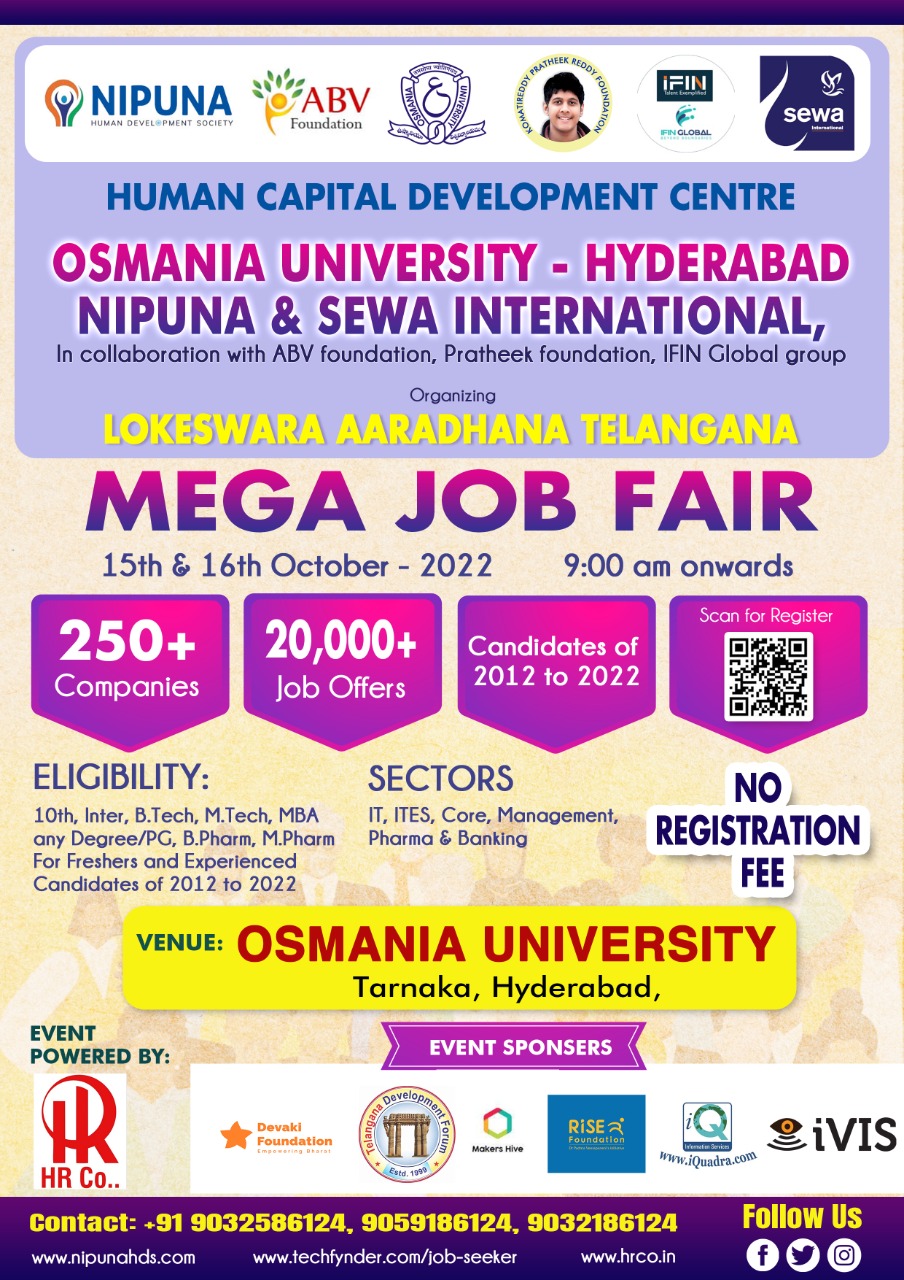 తుల అరుణ్ కుమార్ మాట్లాడుతూ పైన తెలిపిన స్వచ్చంద సంస్థల ఆధ్వర్యములోఉస్మానియా యూనివర్సిటీ లో 250 కంపెనీలు పాల్గొని 20,000 మందికి ఆయా కంపెనీల్లో ఉపాధి అవకాశాలు కల్పించనున్నారని,
