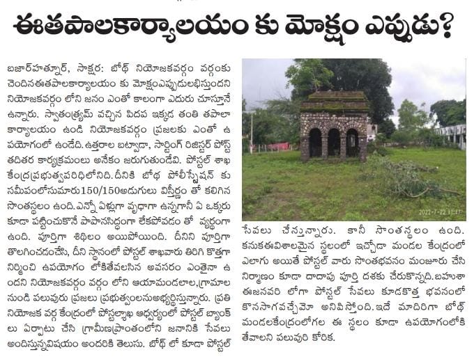 బోథ్ సాక్షర : గత ఆగస్టు నెల తొమ్మిదో తారీఖున సాక్షర దిన పత్రిక లో ప్రచురితమైన "ఈ తపాలా కార్యాలయానికి మోక్షం ఎప్పుడు" అని కథనానికి స్పందించిన ఎంపి చొరవతో తపాలా కార్యాలయ నిర్మాణానికి బుధవారం సర్వేచేసి 23 గుంటల స్థలం ఉందని గుర్తించారు.ఈ సర్వేను ఆదిలాబాద్ పోస్టల్ సూపరిండెంట్ అధికారి కేటీఆర్ ప్రసాదు తో పాటు అసిస్టెంట్ ఇంజనీర్ హేమంత్ కొలతలు చేశారు,మండల కేంద్రంలో గత కొన్ని సంవత్సరాలుగా తపాలా కార్యాలయం లేక ప్రజలు నానా ఇక్కట్లుపడుతున్నారు,పింఛను కొరకు వృద్దులు ఇబ్బందులు పడుతున్నారు,ఎట్టకేలకు తపాలా కార్యాలయం నిర్మించడానికి సర్వే నిర్వహించారు,ఇప్పటికే ఇచ్చోడ మండల కేంద్రంలో పోస్టల్ కార్యాలయ నిర్మాణ పనులు పూర్తి అయ్యాయి,ఆదిలాబాద్ పోస్టల్